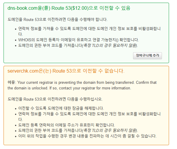 소유하고 있는 도메인에 대해 AWS ROUTE53으로 이전이 가능한지 조회한다.
