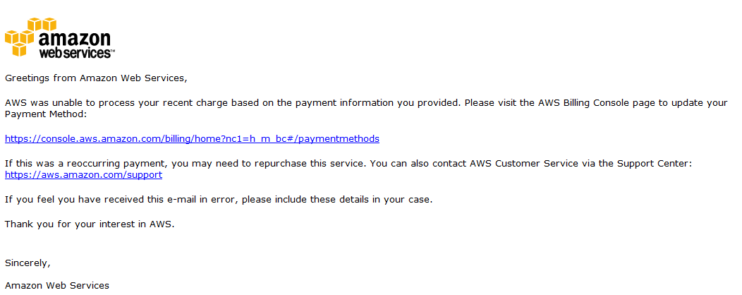 만약, AWS결재 계좌가 제대로 안되어 있다고 메일이 온다.