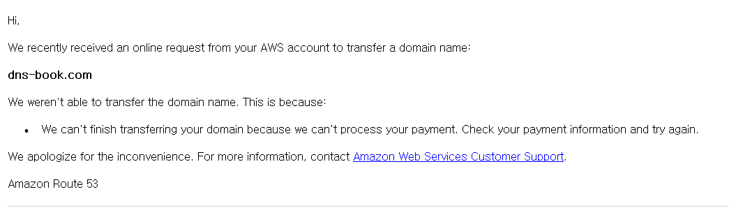 아래는 AWS에 등록된 빌링에 카드 결제 정보가 틀려 이전이 안된다는 내용이다.