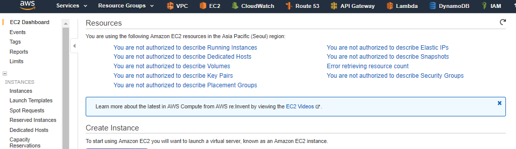 원인 : Cloud9 생성시 , Cloud9은 불특정 IP를 가지므로, 사용자 IP 제한 설정으로 일반계정으로는 Cloud9 이 생성되지 않는다.