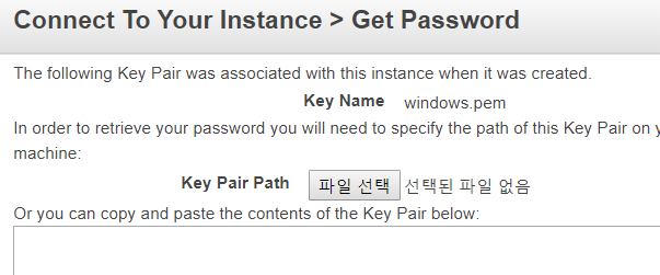 파일선택 > 다운로드 받은 PEM키 선택 > 암호해독 (Decrypt Password)