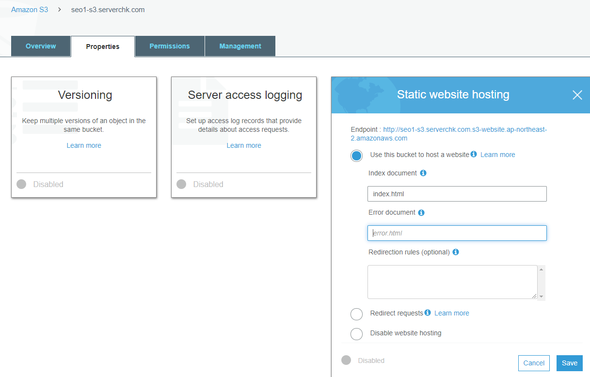 seo1-s3.serverchk.com S3 버킷을 만든다.