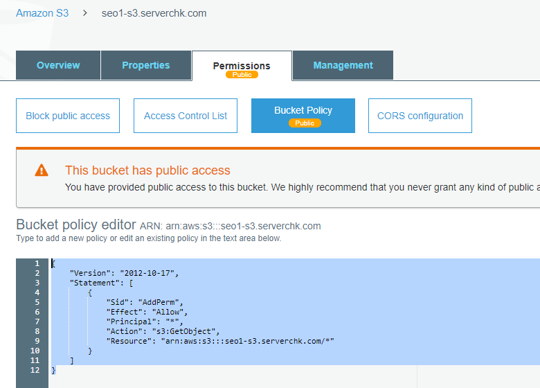 "Resource": "arn:aws:s3:::seo1-s3.serverchk.com/*"