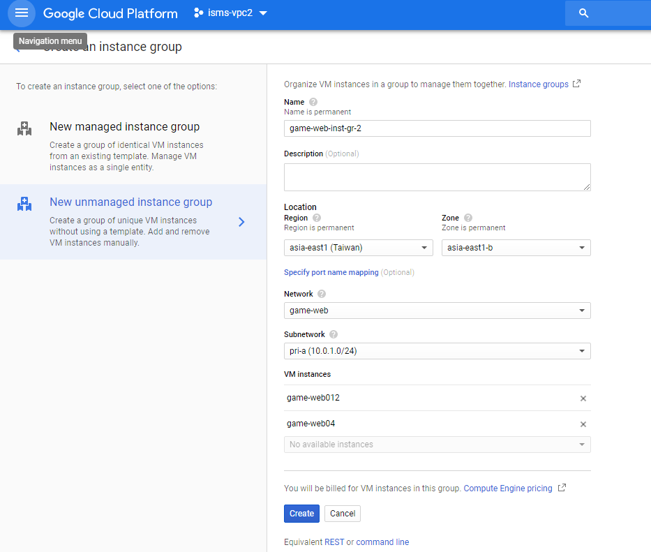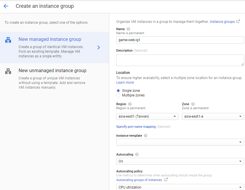 일반적으로 Instance groups 으로 지정하므로 , Instance groups은 사전에 만들어야 한다.