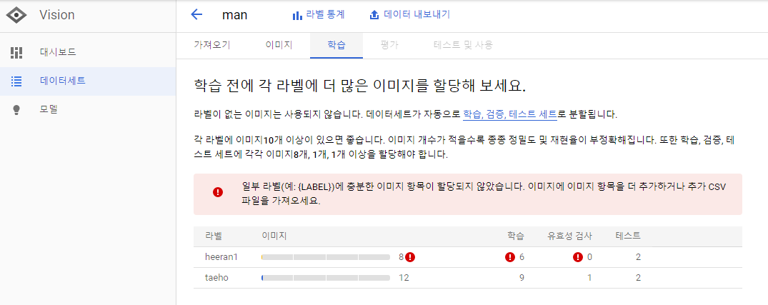이미지가 충분하지 않으면 학습 진행을 하지 못한다.