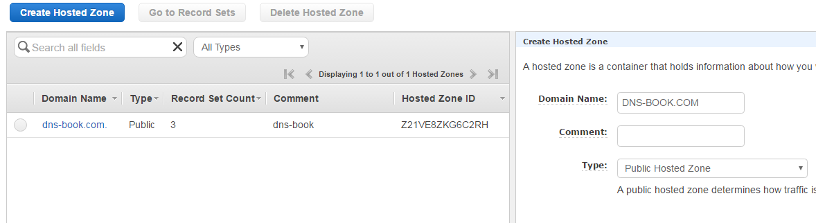 2) 이중화 하고자 하는 dns-book.com 이라는 도메인 추가하면 AWSDNS 네임서버4개가 자동 추가된다.