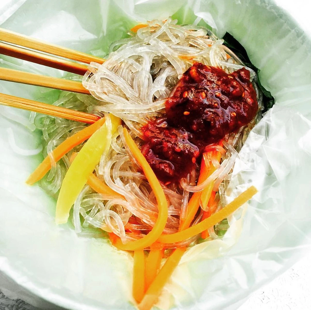 잘 삶아진 따끈한 당면에 짭짤한 양념장 한 스푼