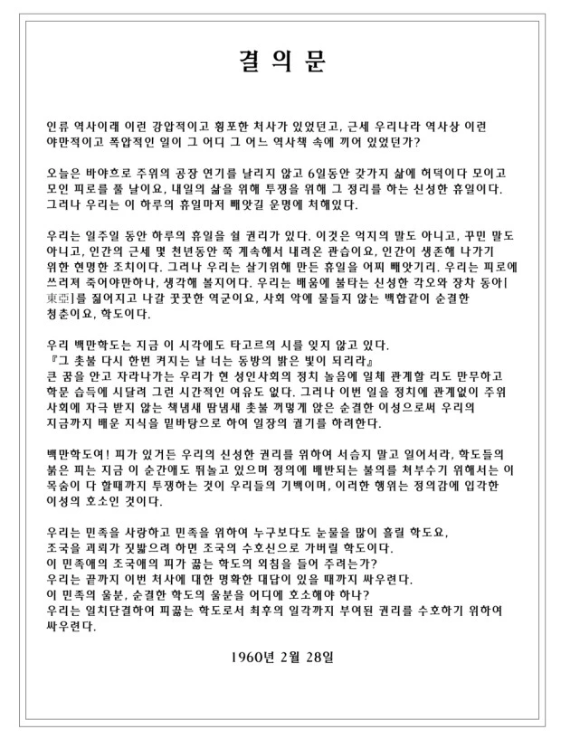 "백만 학도여, 피가 있거든 우리의 신성한 권리를 위하여 서슴지 말고 일어서라. 학도들의 붉은 피가 지금 이 순간에도 뛰놀고 있으며, 정의에 배반되는 불의를 쳐부수기 위해 이 목숨 다할 때까지 투쟁하는 것이 우리의 기백이며, 정의감에 입각한 이성의 호소인 것이다." 당시 결의문중 일부