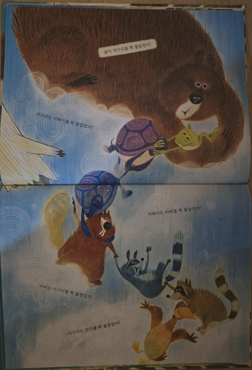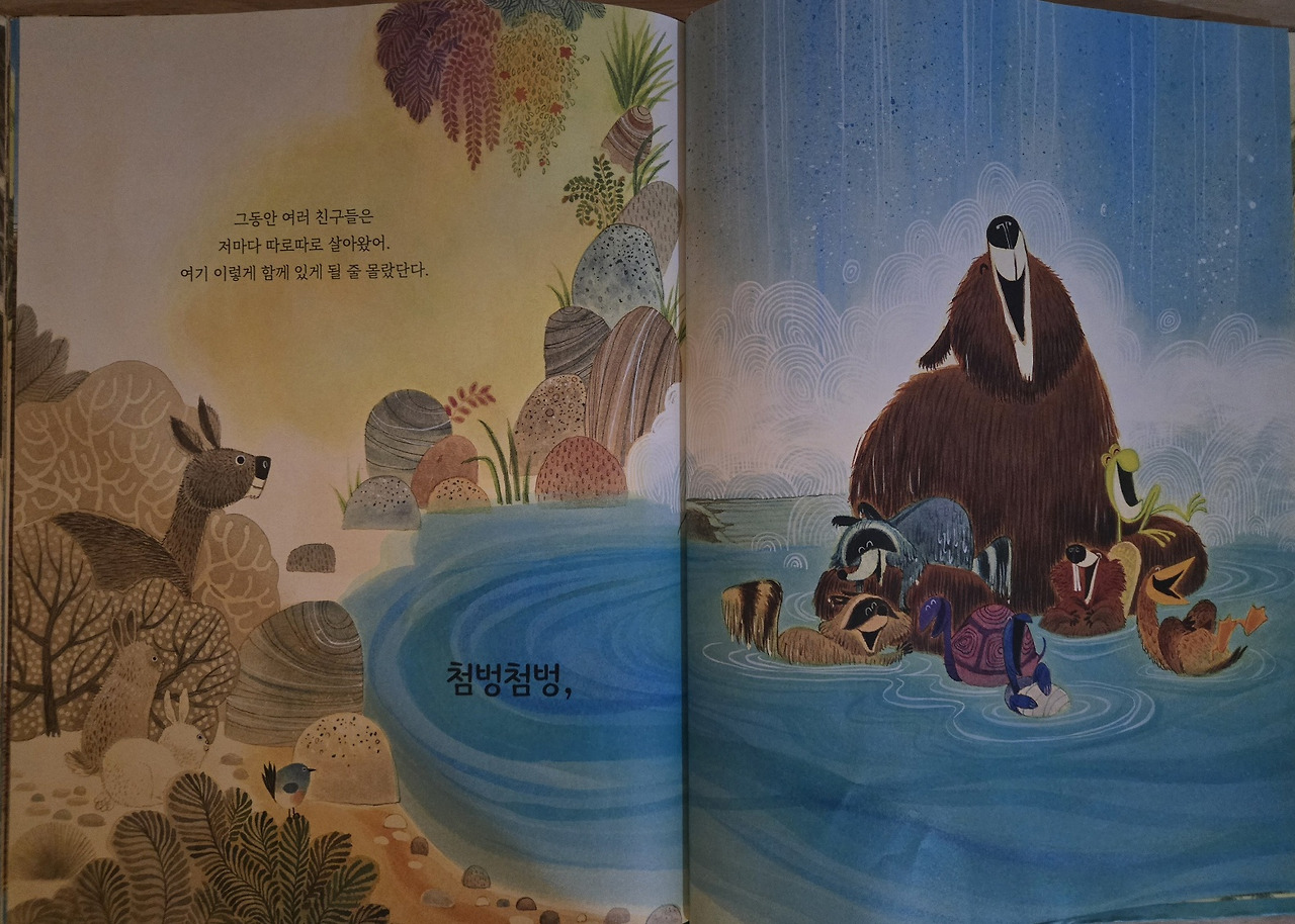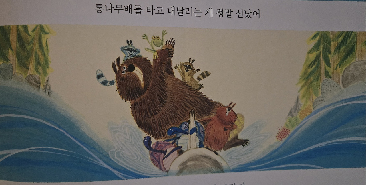 그러다 곰은 철버덩 강에 빠져 통나무를 타고 떠내려갑니다. 여기에 폴짝, 개구리가 뛰어올랐다죠. 개구리는 친구가 없어 개굴개굴 외로워했거든요. 개구리에 이어 통나무배에 차례로 거북이, 비버, 너구리들이 올라탑니다. 조그맣던 통나무배가 요술배처럼 이들을 다 태우며 떠내려가네요.