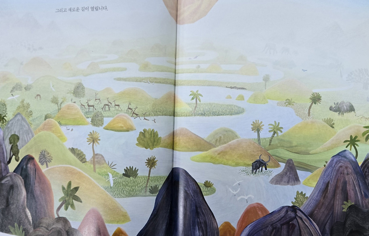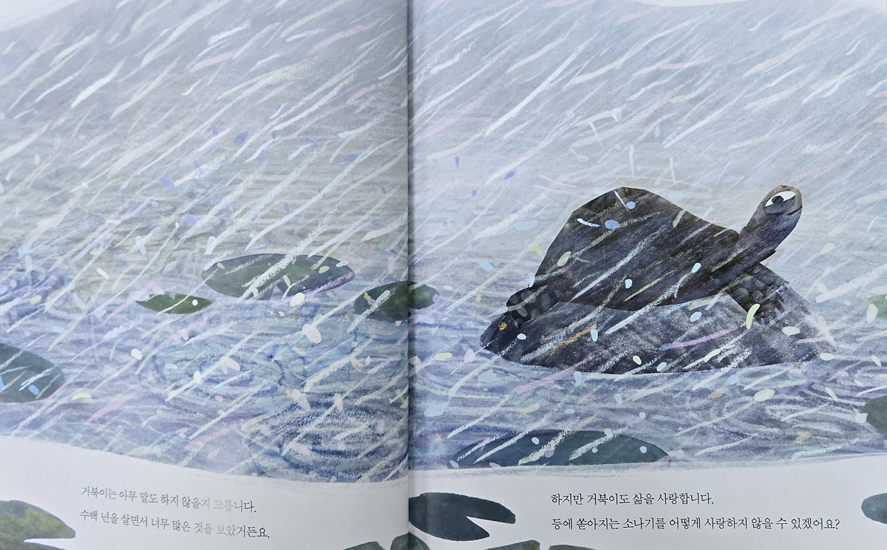 모든 페이지마다 명화 같은 그림책입니다. 그래도 1 점을 꼽으라면 주저 없이 소나기 내리는 바다의 바위 위에 앉아 있는 거북이 그림을 꼽겠습니다. 미소를 띠고 있는 거북이가 도인 같이 느껴지네요.