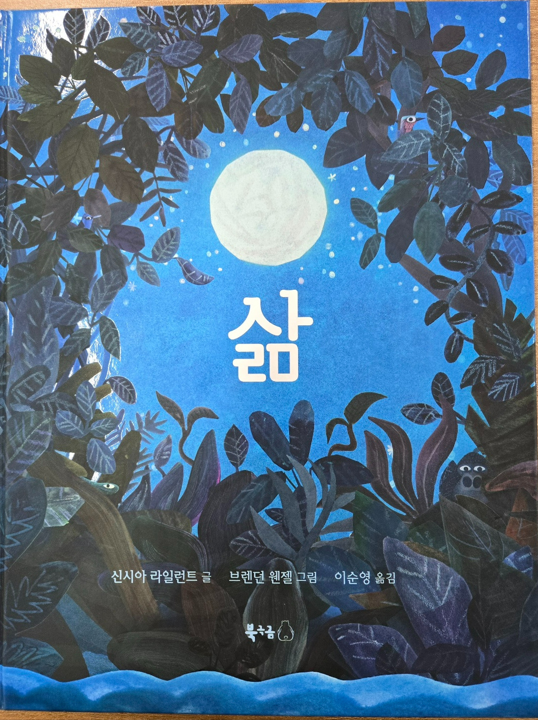 보름달이 환한 밤입니다. 별은 반짝반짝 빛나고 하늘과 강물 모두 짙은 파랑입니다. 숲 속의 식물들은 어두운 색을 띠고 있네요. 나뭇잎들이 둥글게 뜬 달과 그림책 제목 ‘삶’을 화관같이 에워싸고 있습니다. 삶을 환희하는 듯합니다.