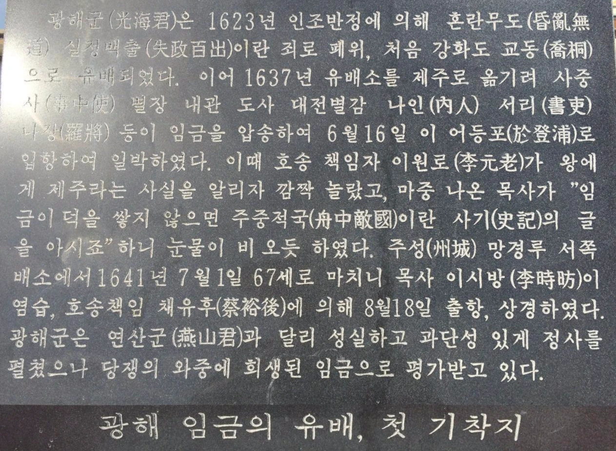 행원마을 안길을 따라가면 광해군의 유배 기착지 비석이 있는 행원포구가 나온다. 비석에 반사되는 햇빛이 거슬려 밀짚모자를 더 눌러쓰고 눈으로만 비석 내용을 읽어 내려간다. 고사성어 주중적국(舟中敵國)이 잠시 씁쓸하게 다가온다. 주자학을 따르는 조선 유교의 정치철학이 ‘덕치주의(德治主義)’이다 보니 가뭄이나 홍수 같은 자연재해도 임금이 덕을 쌓지 못해 일어난 것으로 해석했다고 한다. 임금도 어쩌지 못하는 자연재해를 임금의 부덕으로 귀결시켰다는 것이 이해가 가지는 않지만, 그 만큼 덕(德)이 조선시대의 중요한 정치적 요체인 것은 알겠다. 그래도 나는 안타깝다. 과연 광해군에게 덕이 없다 말할 수 있으며, 덕으로만 나라를 지킬 수 있단 말인가? 광해군은 조선시대의 무능한 선조를 대신하여 조선 팔도를 직접 누비며 임진왜란과 정유재란을 수습했다. 또한 국제정세에 밝아 실리적인 중립외교로 명/청 전쟁에 휩쓸리지 않았다. 그런 그가 당쟁에 휘말려 인조반정으로 폐위되고 제주에 유배를 온 최초의 임금이 되었다. 당시 광해군은 유배지가 제주도인지 모른 채 강화도에서 출발했다고 한다. 배(船)의 사면을 휘장으로 둘러 밖을 볼 수가 없었다. 어등포(행원포구)에 도착했을 때, 광해군의 절망과 탄식이 어떠했을까? 그런 광해군에게 한낱 제주 목사 따위가 주중적국을 언급하다니. 안타깝다 못해 자못 씁쓸했다. 비문을 쓴 사람도 나의 생각에 동조한 듯 아래의 글로 마무리를 했다.