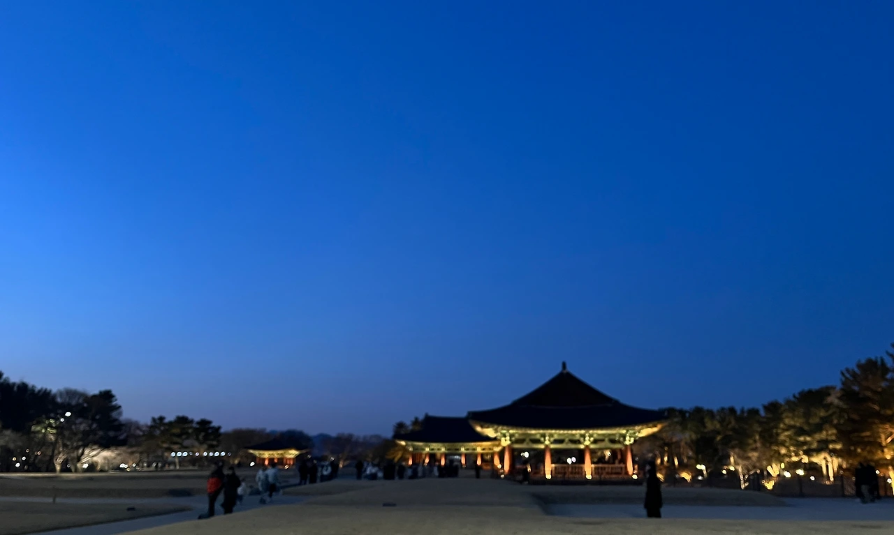 '동궁과 월지'에 예정 보다 일찍 도착한 덕분에 낮과 밤의 모호한 경계 속에서 '월지'를 바라볼 수 있었다. 경주의 서쪽으로 검붉은 노을이 해와 함께 땅 속으로 내려앉을 즈음 노을색을 닮은 조명이 동궁을 둘러쌌다. 50명 남짓의 사람들이 사진을 찍으려고 한 곳에 몰려들었다. 나는 그들이 연출한 광경에서 열 걸음 물러난 언덕에서 월지를 내려다보았다.