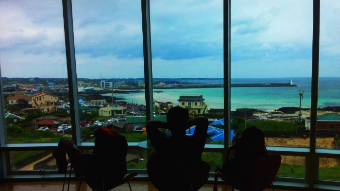 #9. 높은 곳에서 낮은 곳을 바라볼 때, 인간이 만든 몇 가지 발명품을 조합하면 매우 훌륭한 광경을 누릴 수 있다. 많은 것들을 담을 수 있는 큰 창, 등을 기댈 수 있는 의자, 집중을 도와주는 적당한 조명 또는 어둑하지만 따뜻한 컴컴함. 큰 맘을 먹고 한 시간을 달려 도착한 어느 미술관 2층에서 제주 세화의 풍광을 다시 떠올렸다.