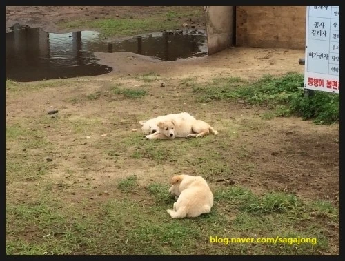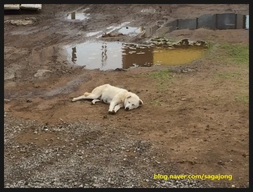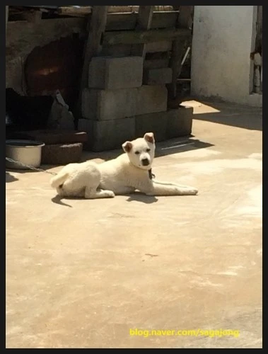 벨롱장에서 해녀박물관으로 가는 길을 잘못 들어서 민가 옆을 지나다가 만난 녀석. 우렁찬 목소리로 집을 지켰던 경계심 많았던 황구우도로 향하는 길에서 건물 신축 공사장에 있던 어미 백구와 강아지들. 불러도 반응이 없었다.