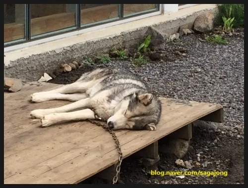 시흥리 펜션 클로버를 지키는 말라뮤트(추정). 눈인사를 하고 싶었지만 곤한 잠을 깨울가봐 사진만 찍었다.