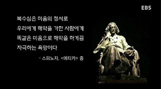 『강한 자에게 핍박을 받는 약자가 어떻게 강자에게 자신이 당한 것을 되돌려줄 수 있다는 말인가? 복수를 시행할 힘조차 없는데. …. (중략)…… 약자가 복수를 포기하는 순간, 자신이 강자에게 복수할 수 조차 없는 존재라는 자괴감에서 벗어나게 된다. 그러나 잊지 말자. 사랑이든복수든 그것은 오직 자유로운 자, 혹은 강자만이 누릴 수 있는 욕망이라는 사실을. 약자는 원수를 용서할 자격조차 없다. 강자가 되었을 때에만 약자는 원수를 용서할 자격을 갖게 되니까 말이다. 그러니 해악을 당했지만 복수할 수 없을 정도로 약하다면, 아주 천천히 힘을 키워서 강해져야 한다. 5년이든 10년이든 치욕을 잊지 말고 가슴속에 새겨야 한다. 마침내 해악을 가한 사람보다 압도적인 우위에 있게 되는 날. 우리는 결정할 수 있다. 계획대로 복수를 추진할 수도 있고, 아니면 용서할 수도 있다.” – 강신주의 감정수업 “복수심”中 강신주 저』