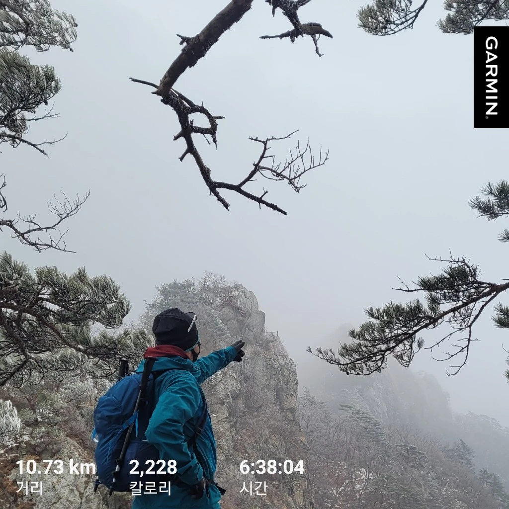 영봉에 도착했다. 영봉에 오르는 계단은 수직처럼 가팔랐고 계단 옆에 깎아지른 절벽을 볼 때마다 악 소리가 났다. 산 아래는 안개로 아무것도 보이지 않았다. 정상에는 신령이 살 것 같은 기운이 느껴졌다. 그제야 천왕봉처럼 멋진 이름 대신 영봉이란 이름이 됐는지 알게 됐다. 다리는 신령이 나타난 것처럼 후들거렸다.
