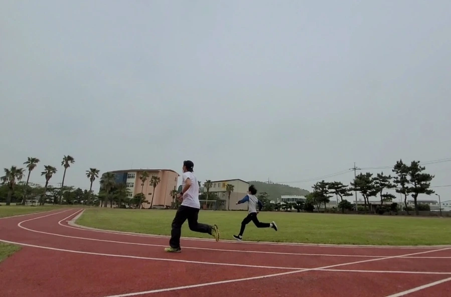 승부를 끝낸 아들은 승자의 여유를 온몸으로 표현했다. 나는 우리가 달리는 모습을 영상으로 남기고 싶었다. 스마트폰을 한쪽에 설치하고 아들과 출발선에 섰다. 아들은 인코스, 나는 아웃코스. 나의 출발 신호와 함께 우리는 열심히 달렸다. 50미터를 지나며 아들은 조금씩 쳐졌다. "서준아. 멈추지 말고 끝까지 달려"