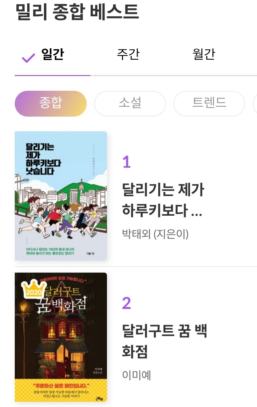 밀리의 서재 오늘의 책에 선정된 지 하루가 지난 오늘 종합베스트 1위에 올랐다. 달러구트 위에 있다니, 이게 꿈인가 생시인가? 일일천하인지 뻔히 알면서도 마음은 춤춘다. 하루든 한 달이든 일 년이든 무엇이 중한가? 나란 사람은 무엇이든 한 번 해봤다에 의미를 부여하니, 지금도 충분히 감사하다.