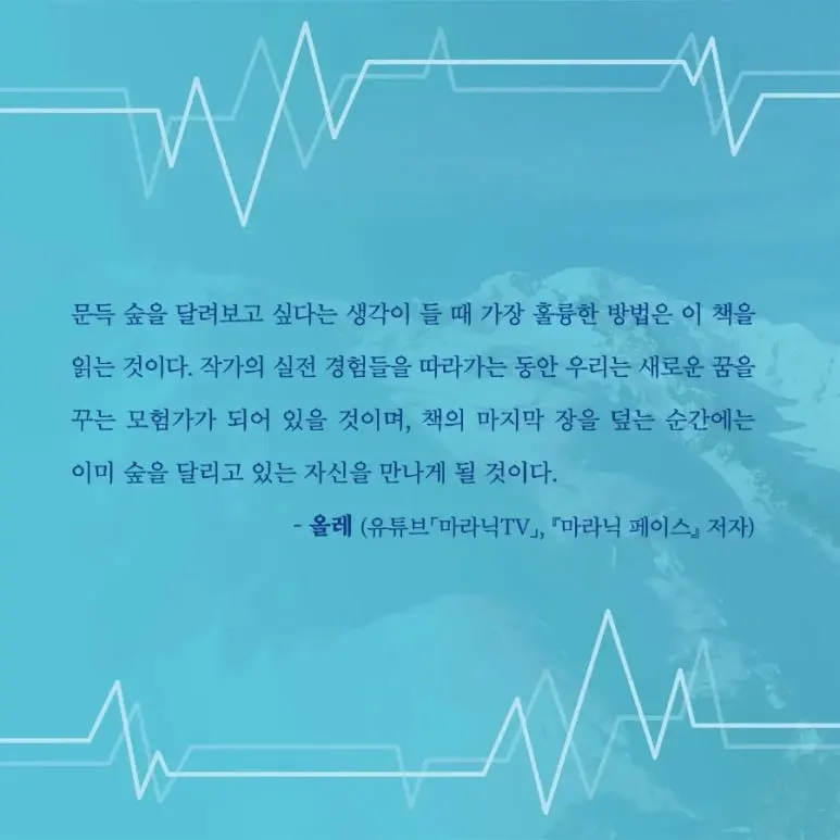 어떤 부분을 읽을 땐 '이런 것도 있구나'하는 부분이 분명히 있을 것입니다. 영감을 얻어 가면 참 좋겠습니다. 아무튼 이 책이 산에서 달리는 사람을 한 명이라도 만든다면 참 좋겠습니다. 어느 날 산에서 그런 분을 만나면 가문의 영광이겠습니다. 누군가를 변화시킨다는 게 쉽지는 않으니까요.