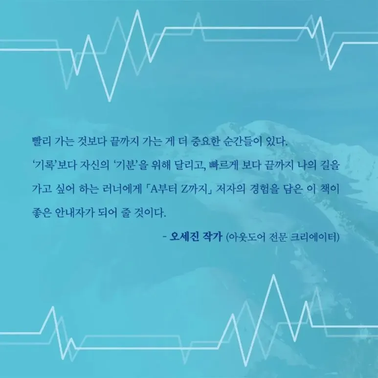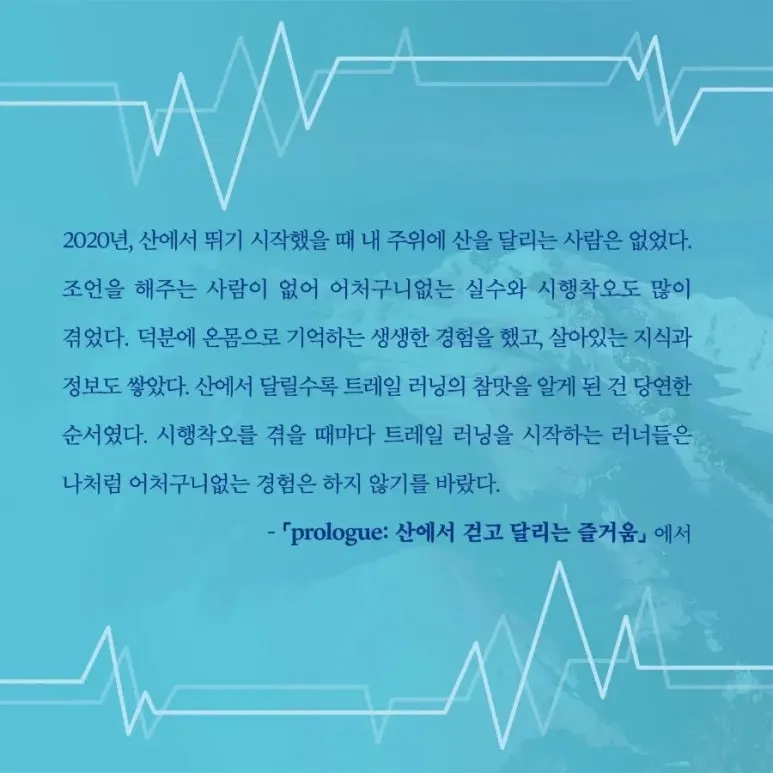 추천사 내용은 아래와 같습니다. 앞으로 이 책을 읽을 독자분들도 세 분과 같이 만족하길 바랍니다. 트레일러닝도 각자의 이유로 하고 이 책도 각자의 이유로 읽을 것입니다. 이유야 어떻든 만족스럽게 책을 덮는다면 저도 기분이 좋을 것 같습니다.