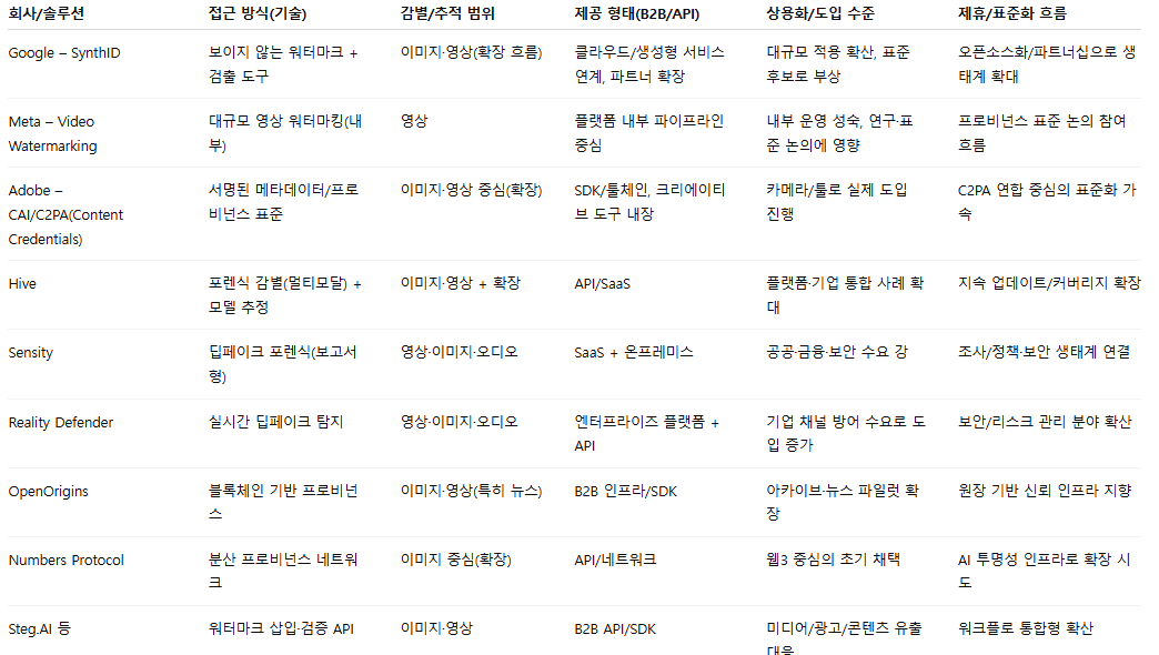 이 조합은 “사전 표기 → 유통 감시 → 사후 증명”의 전체 파이프라인을 구성해, 저작권 이슈(소유/책임/원본성)를 실무적으로 해결하는 방향으로 수렴한다. 규제(라벨링 의무, 생성물 표시 요구)와 플랫폼 정책이 강화될수록, 기업 고객은 자체 구축보다 API 형태로 빠르게 붙일 수 있는 B2B 솔루션을 선호한다.