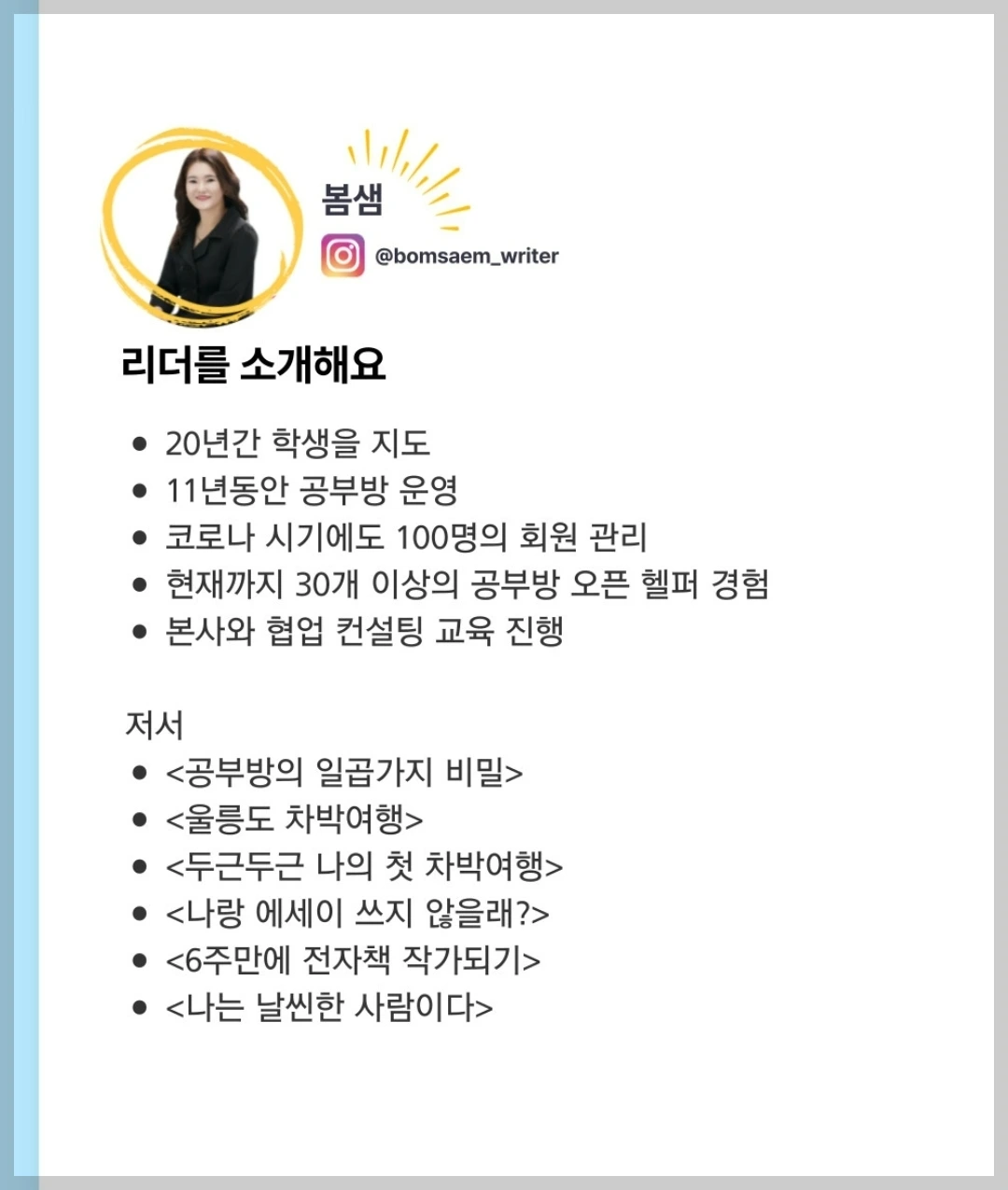 그 와중에 꾸준히 한 것이 공부방운영이다. 직업도 많은 경험이 있다. 연결성이 없는 직업들이었다. 학원강사, 학습지교사, 푸르덴셜 LP, 한미은행 대출담당직원 등 너무도 다양한 직군에서 일했지만 이렇게 오랜 기간 꾸준히 해온 것이 없었다. 어느덧 올해로 11년 차이다. 이렇게 꾸준히 하다 보니 이쪽에서는 그래도 나름 유명인사가 되어있다. 너무나 감사할 따름이다.