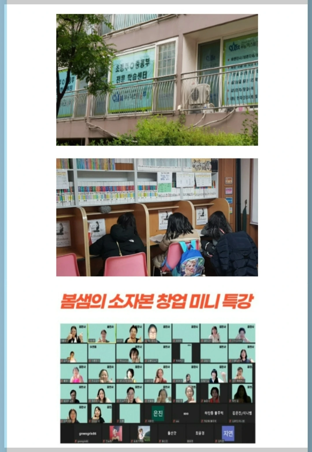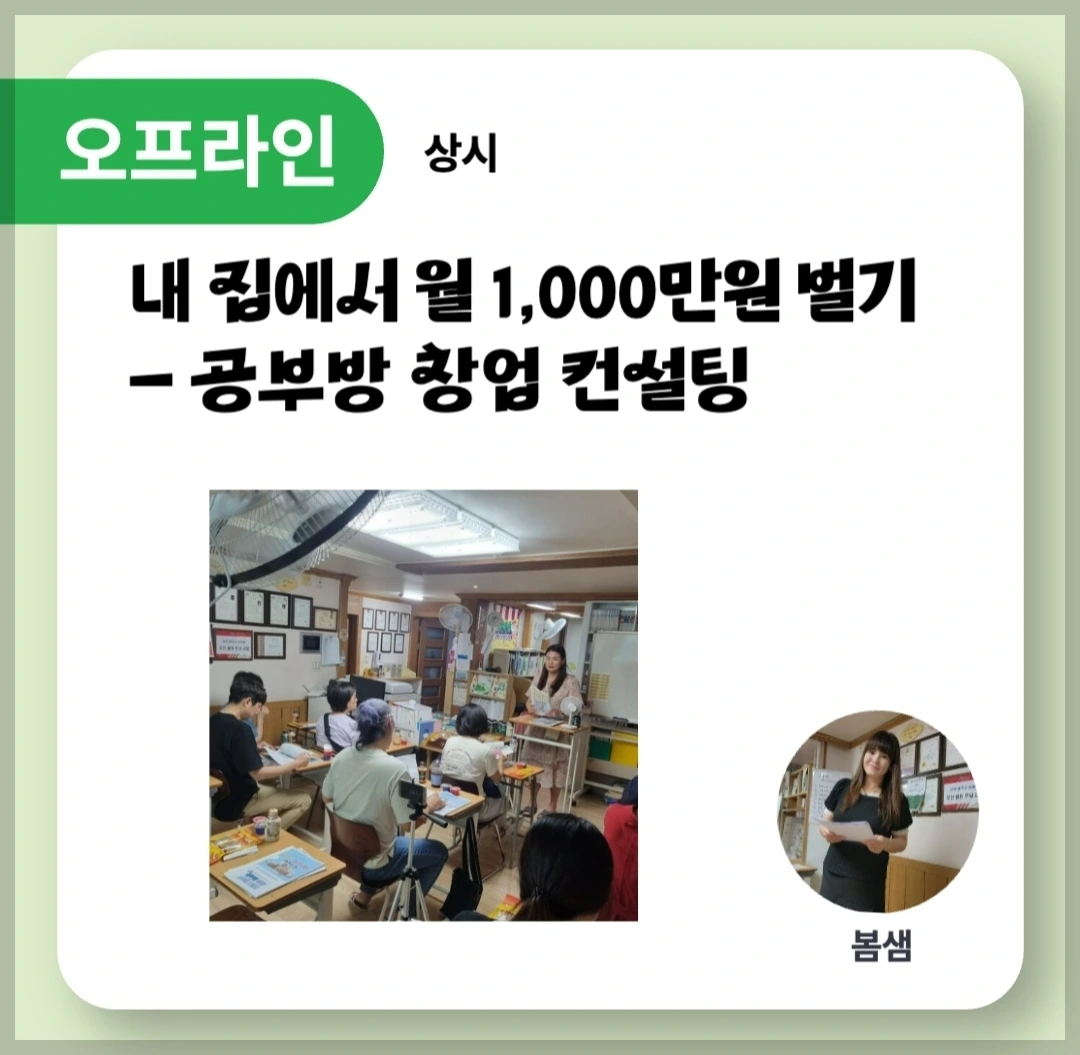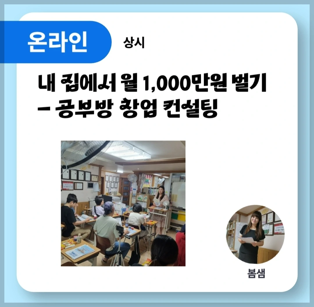 이 경력이 전부일 줄 알았는데 올해부터는 온라인에서도 공부방과 관련하여 창업 컨설팅을 진행하고 있다. 커뮤니티 안에서 미니특강을 시작으로 올해 가장 많은 개인 컨설팅을 진행했다.
