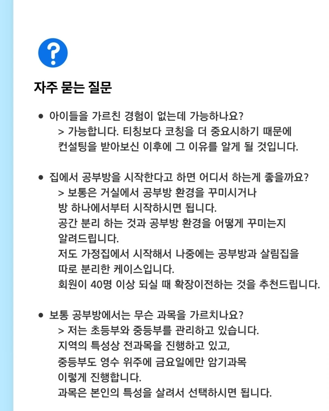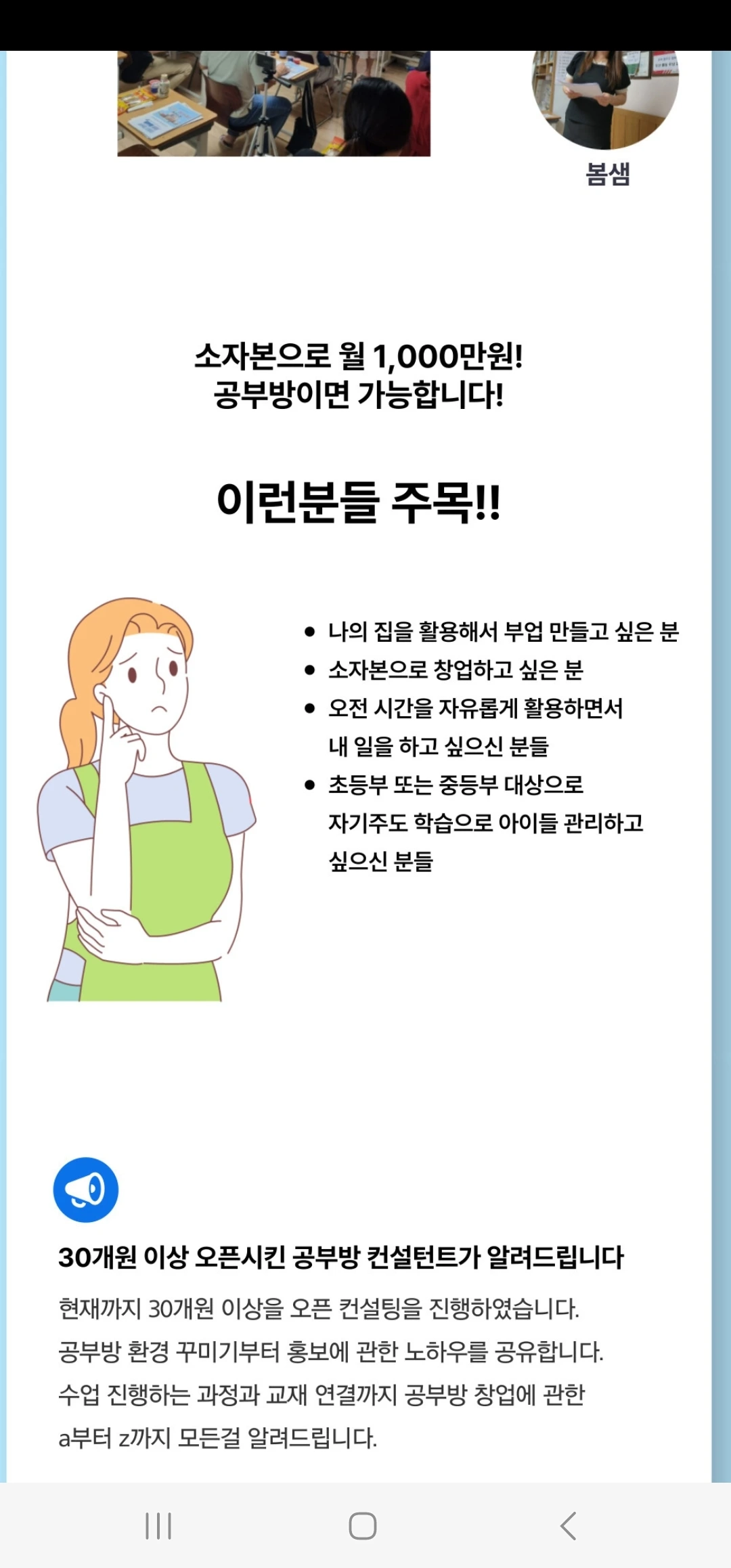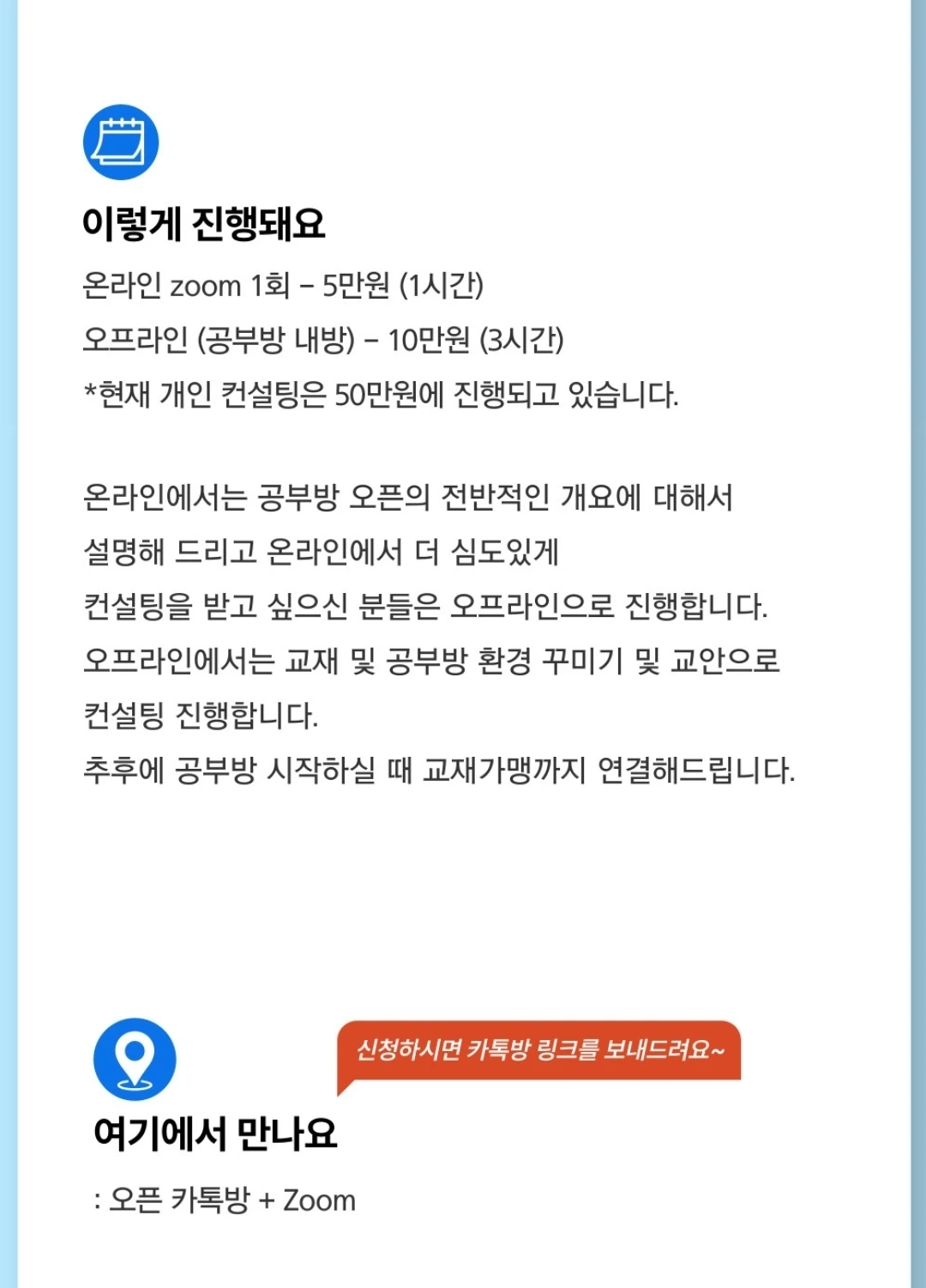이 경력이 전부일 줄 알았는데 올해부터는 온라인에서도 공부방과 관련하여 창업 컨설팅을 진행하고 있다. 커뮤니티 안에서 미니특강을 시작으로 올해 가장 많은 개인 컨설팅을 진행했다.