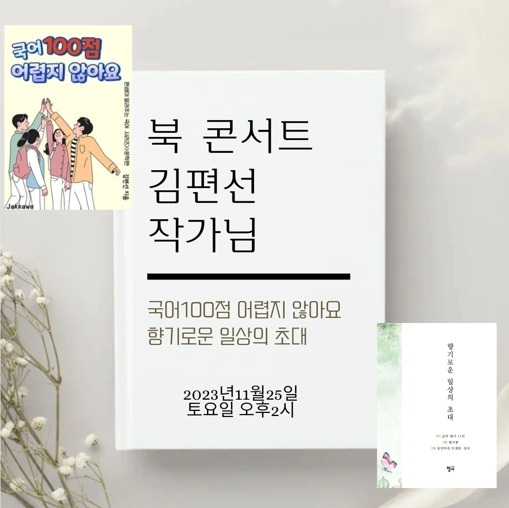 김편선 작가님은 국어 100점 어렵지 않아요를 출간하시고, 얼마 되지 않아 향기로운 일상의 초대라는 공저 시집도 종이책으로 발간하셨습니다. 이 두 가지 책을 함께 엮어서 북 콘서트를 진행할 예정입니다.