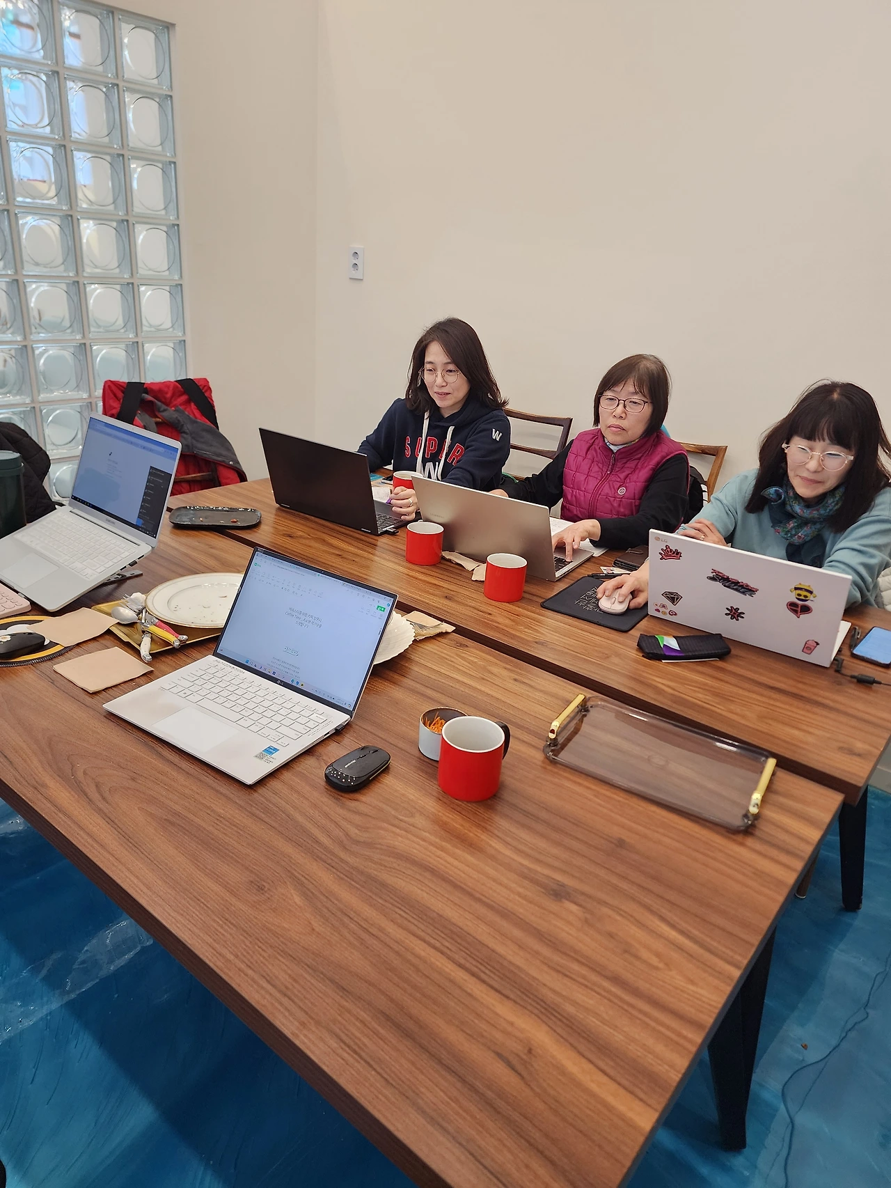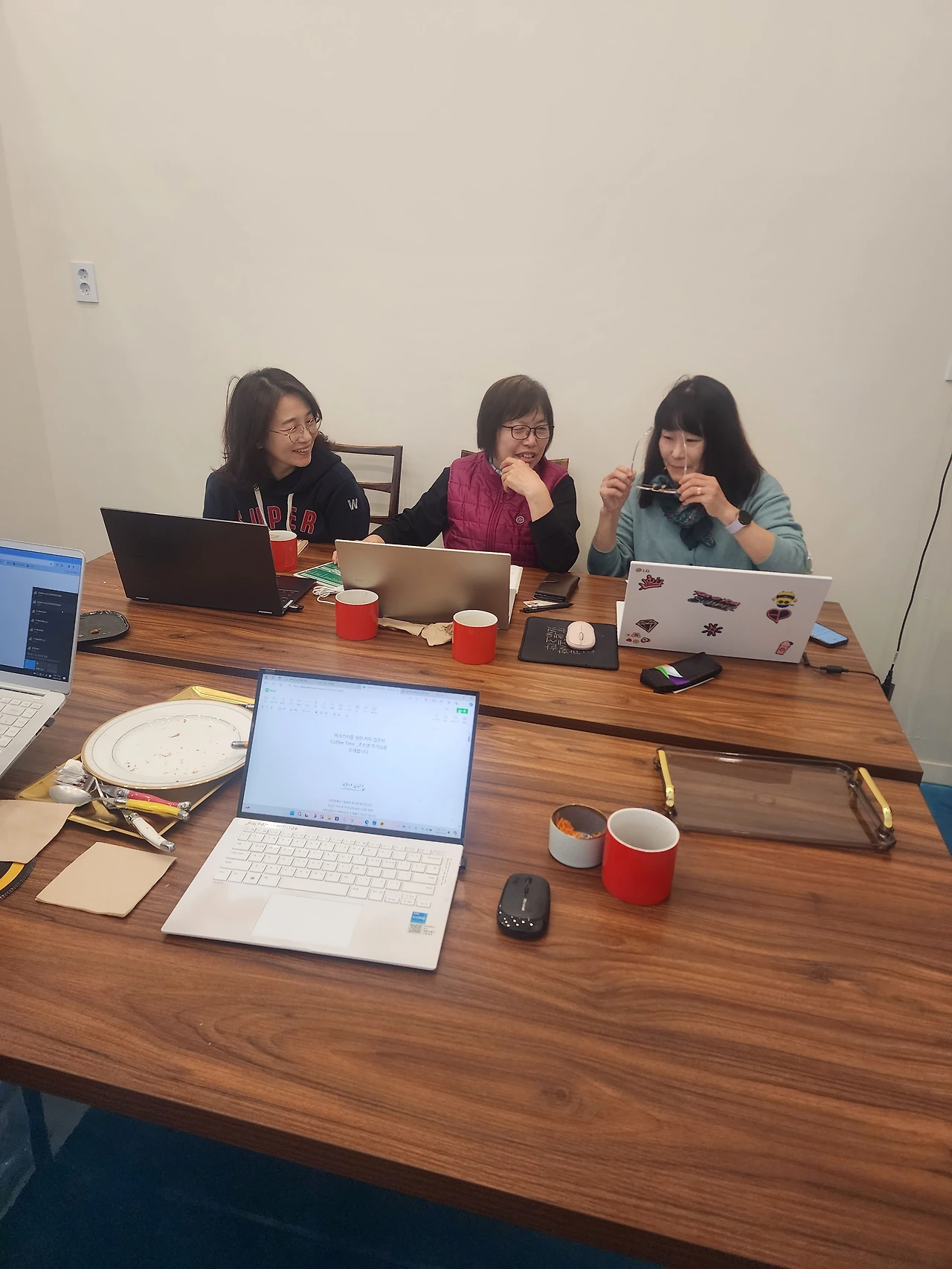 내일 새벽 줌에서 또 만나기에 괜찮다 생각되지만 이렇게 가끔 오프라인에서 만나면 오래도록 함께 있고 싶다. 노트북 하나씩만 준비하면 어찌나 할 것들이 많은지 모르겠다.