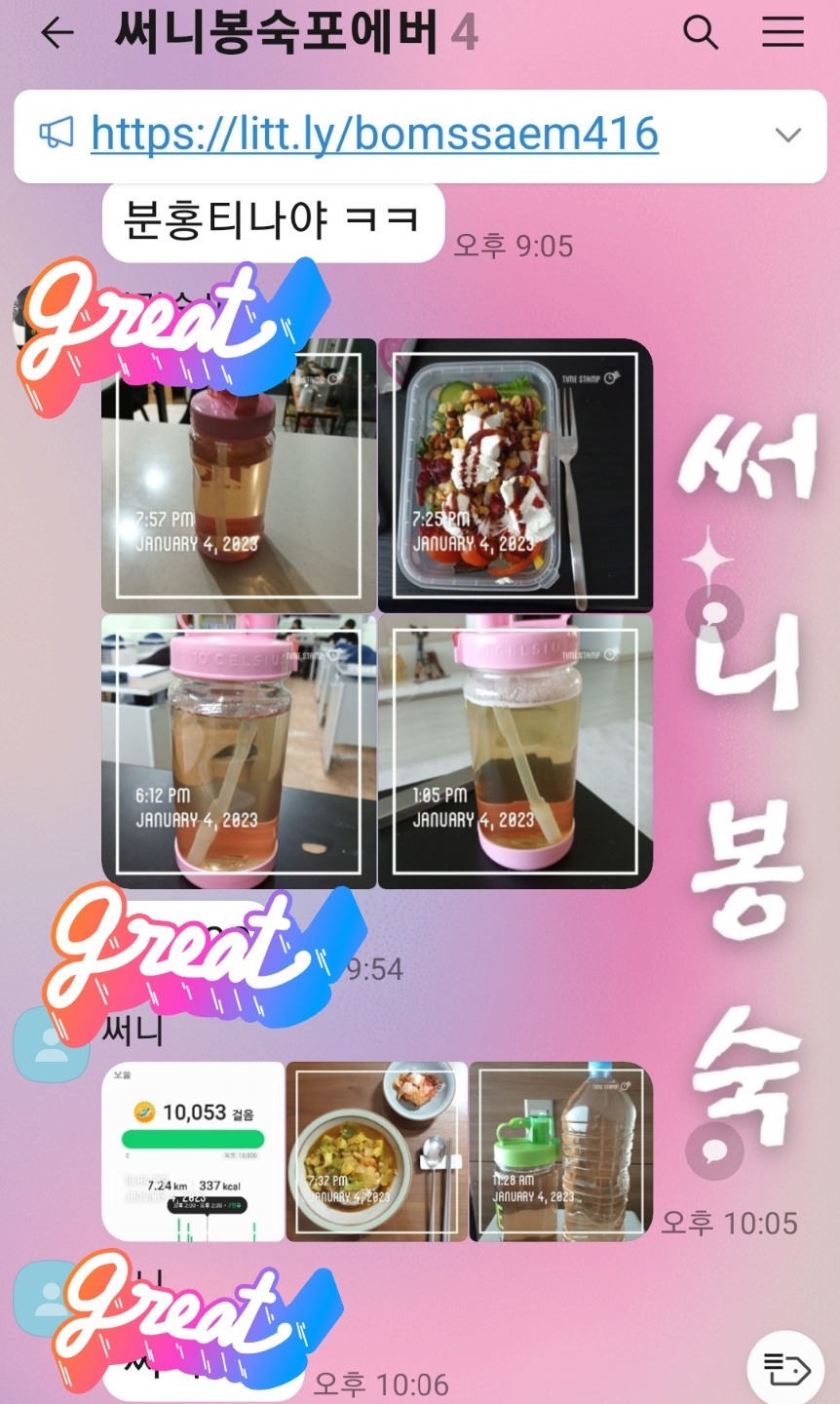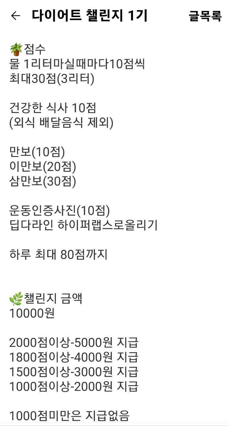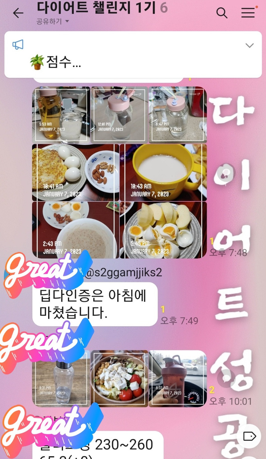 하루에 3리터 이상씩 마시자고~~ 물을 많이 마시지 않는 친구들인데 나의 다이어트 습관을 전달해 주고 우리끼리 건강 인증해서 매일 올리자고 했다. 반응은 폭발적이었다. 열심히 독려하기 위해서 정해진 점수를 넘기면 회비에서 금액대별로 차등을 두어 환급해 주는 것을 선택했더니 꾸준히 다들 한 달에 만원씩 이상은 할인을 받는다. 결과적으로 친구들 모두 2년 차로 접어든 지금은 적게는 5~20kg 감량하는 놀라운 결과를 보고 있다.