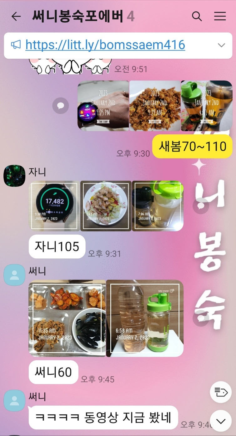 이런 동기가 확실하니 다들 살이 빠졌고 성격이 밝아지고 긍정적이며 매사에 하고자 하는 의욕도 많이 늘어난 것도 사실이다. 매일 물 3리터 마시기/ 만보 걷기/건강한 식사 올리기 매일 인증사진을 타임스탬프 어플을 사용하여 올리고 점수는 각자가 기록해서 마지막날 정리해 주면 끝이다. 이렇게 한 지가 햇수로 2년 차이다. 개인적으로 나는 이러한 챌린지가 3곳이다. 이렇게 생활 속에서 진행해야 슬럼프 없이 지속할 수 있는 것 같다.