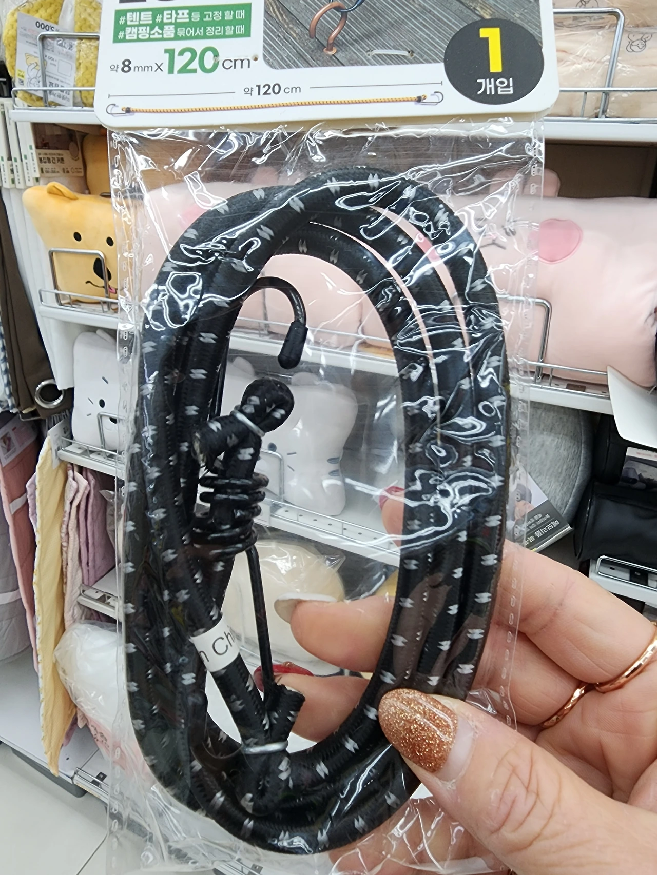 스트레치 코드는 내가 차박 초반에 유용하게 사용하였던 용품으로 2열과 3열의 손잡이 부분에 걸어놓고 커튼이나 가림막을 걸어서 사용하기에 편한 물건이다. 여름에는 간단한 빨래도 널어놓을 수 있어서 지금도 항상 두 개씩을 비치해 놓고 사용한다. 인터넷상으로는 조금 더 비싸게 구입했었다.
