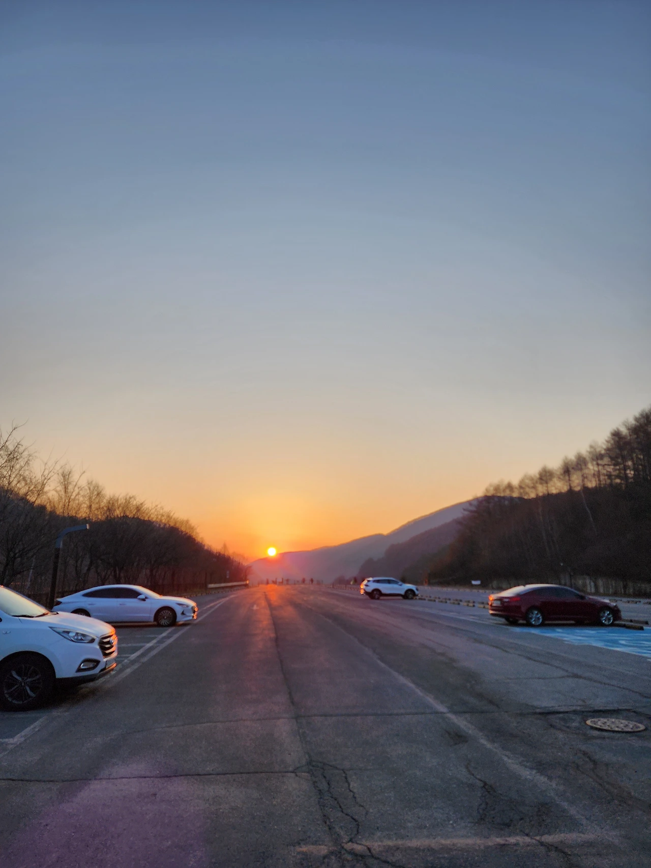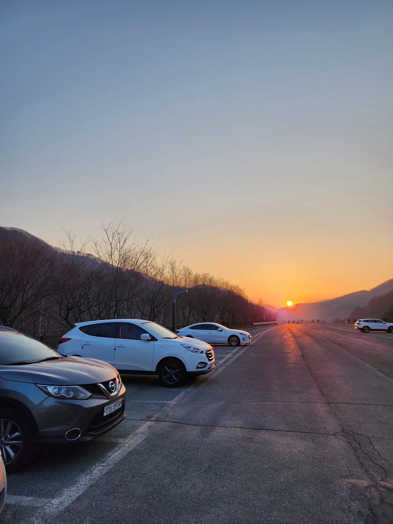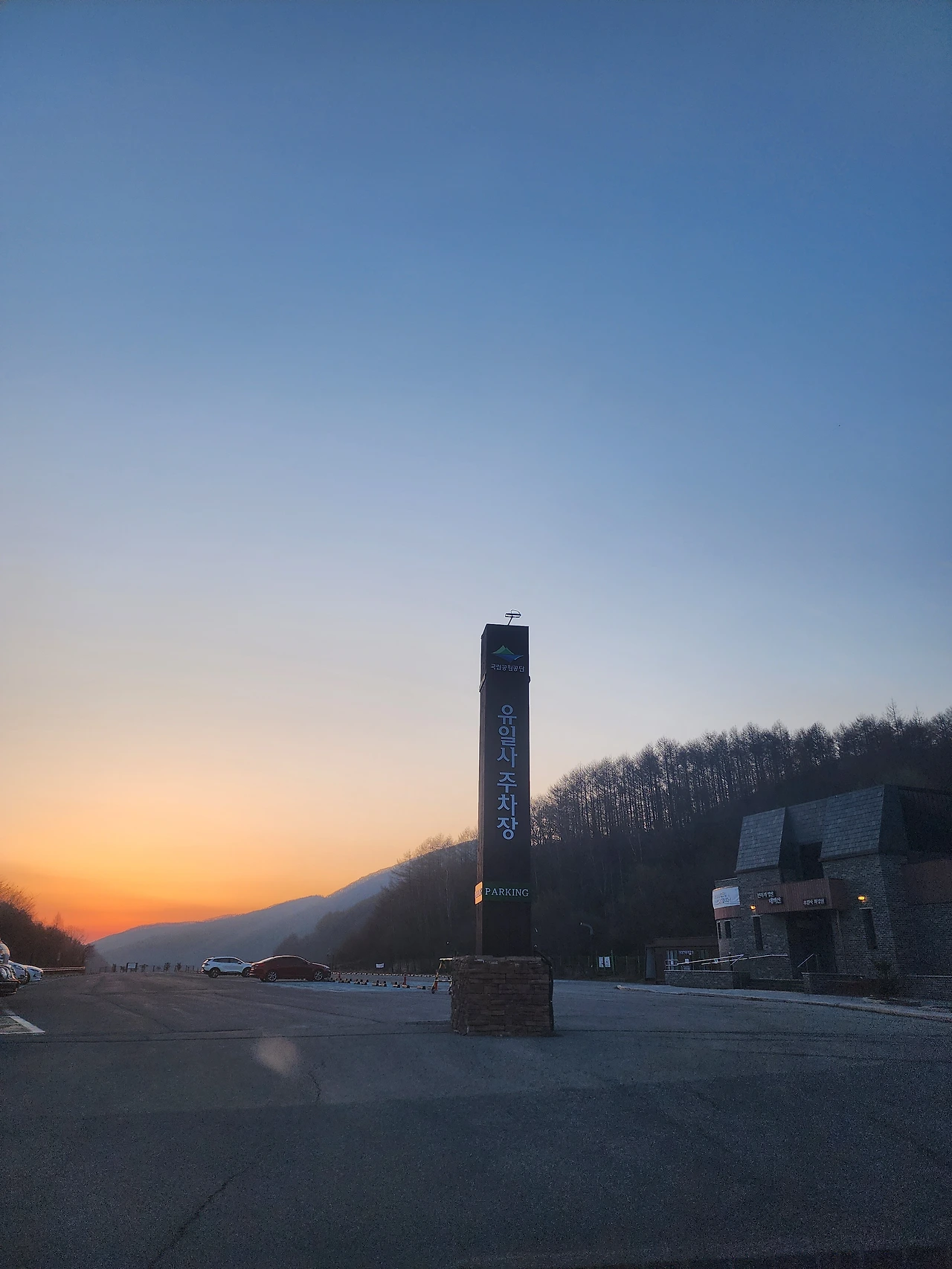 늦은 저녁 11시쯤에 도착한 태백산의 유일사 주차장입니다. 칠흑같이 어두워서 아무것도 보이지 않았는데 새벽이 되니 일출을 보면서 정말 잘 왔다는 생각이 제일 먼저 들더라고요