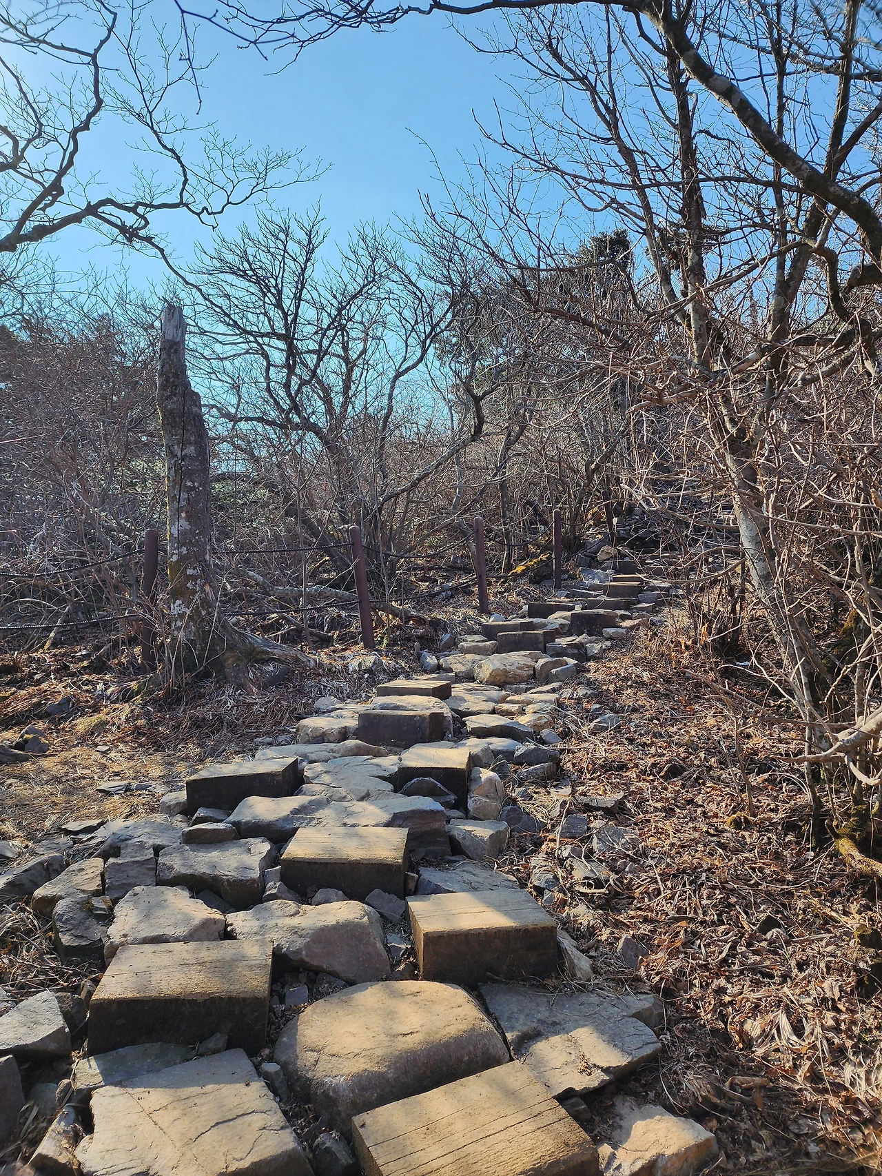 태백산은 생각보다 어렵지 않아서 낮은 경사도로 계속 이어집니다. 그리 힘든 경사는 아니었습니다. 자갈이었다가 파쇄석이었다가 큰 돌들로 이루어진 디딤돌등으로 이루어져 있어서 지루할 틈이 없었습니다.