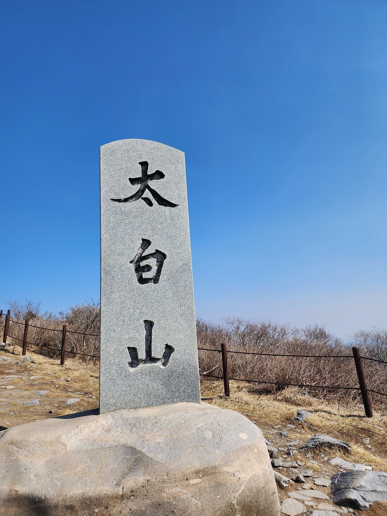 정상석이 이름에 걸맞게 아주 역동적입니다. 정상석 옆에서 사진 한 장 찍어주고 저 멀리 보이는 천제단을 향해 이동합니다. 하늘에 제사를 지내던 천제단! 가는 길마저 너무 예쁘네요~~ 더 따뜻한 봄에 천제단까지 가는 길에 철쭉 터널을 지나면 엄청나겠어요. 아쉽게도 꽃망울까지만 확인하고 이동합니다.