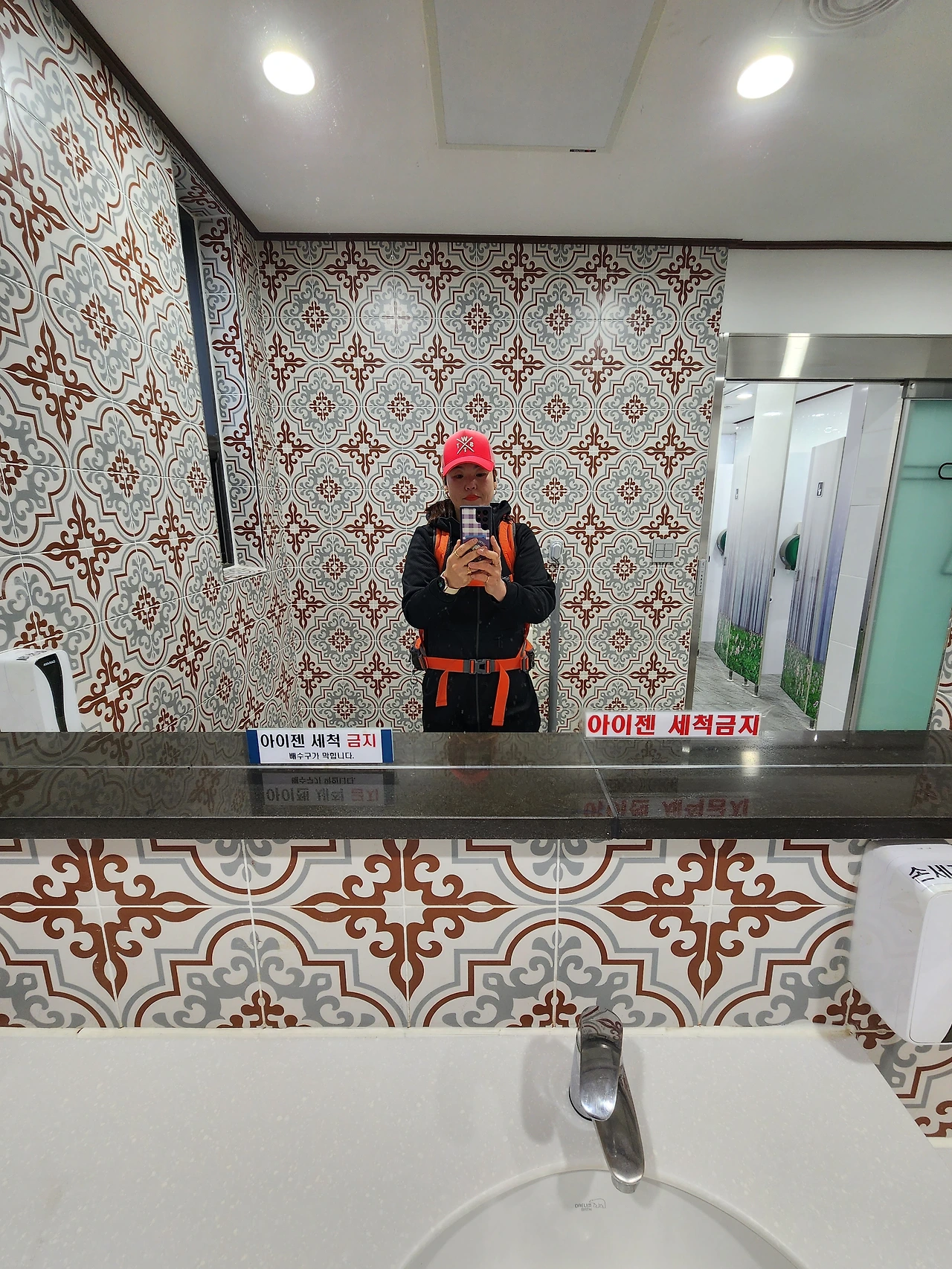 가장 중요한 국립공원 스탬프 투어 여권을 단단히 챙기고 화장실에서 마지막 점검 사진도 찍고 출발합니다.