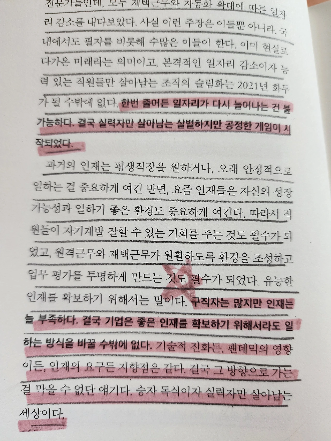 [구직지는 많지만 인재는 늘 부족하다. 결국 기업은 좋은 인재를 확보하기 위해서라도 일하는 방식을 바꿀 수밖에 없다. 기술적 진화든, 팬데믹의 영향이든, 인재의 요구든 지향점은 같다. 결국 그 방향으로 가는 거 막을 수없단 얘기다. 승자 독식이자 실력자만이 살아남는 세상이다. ]