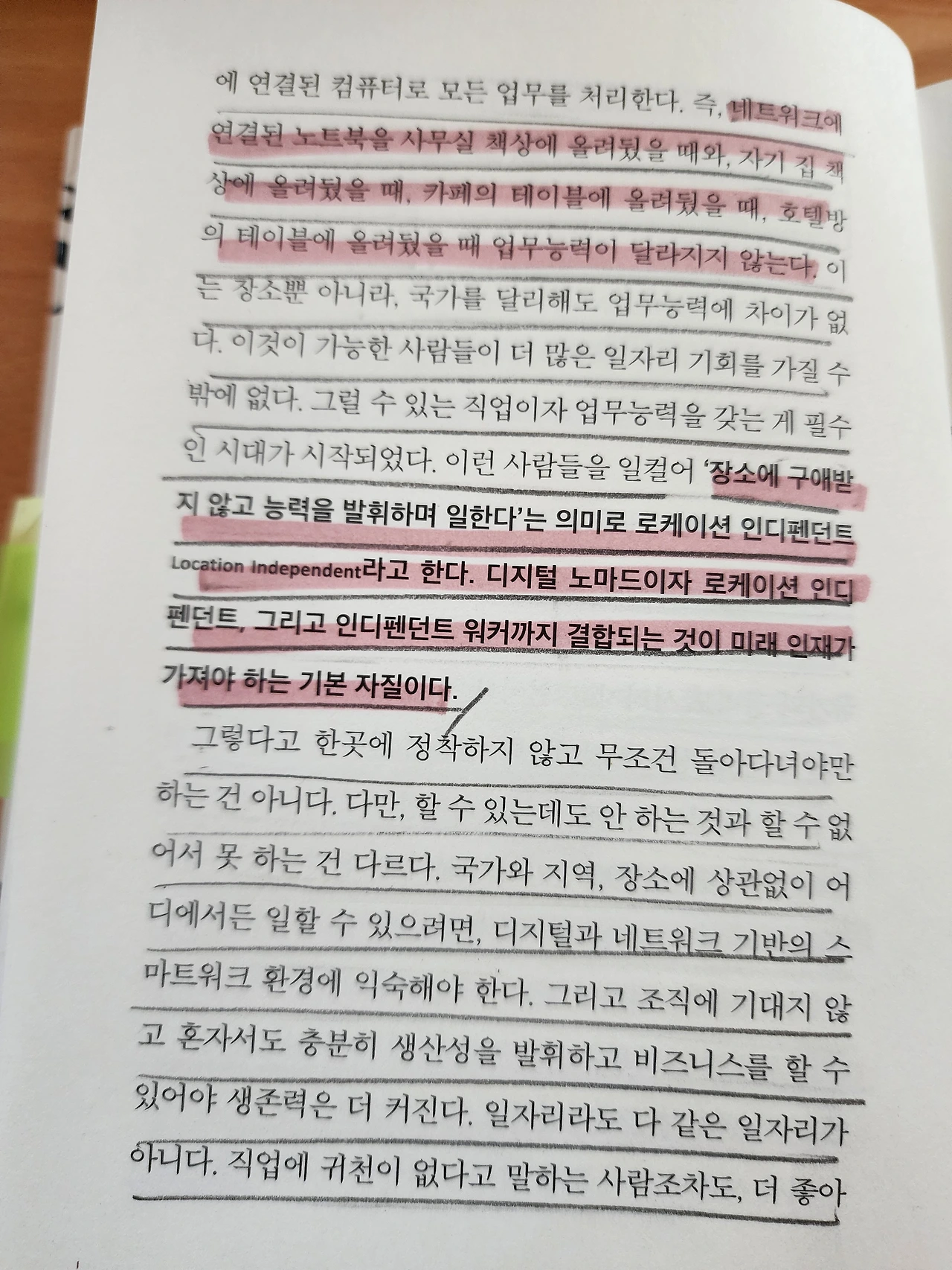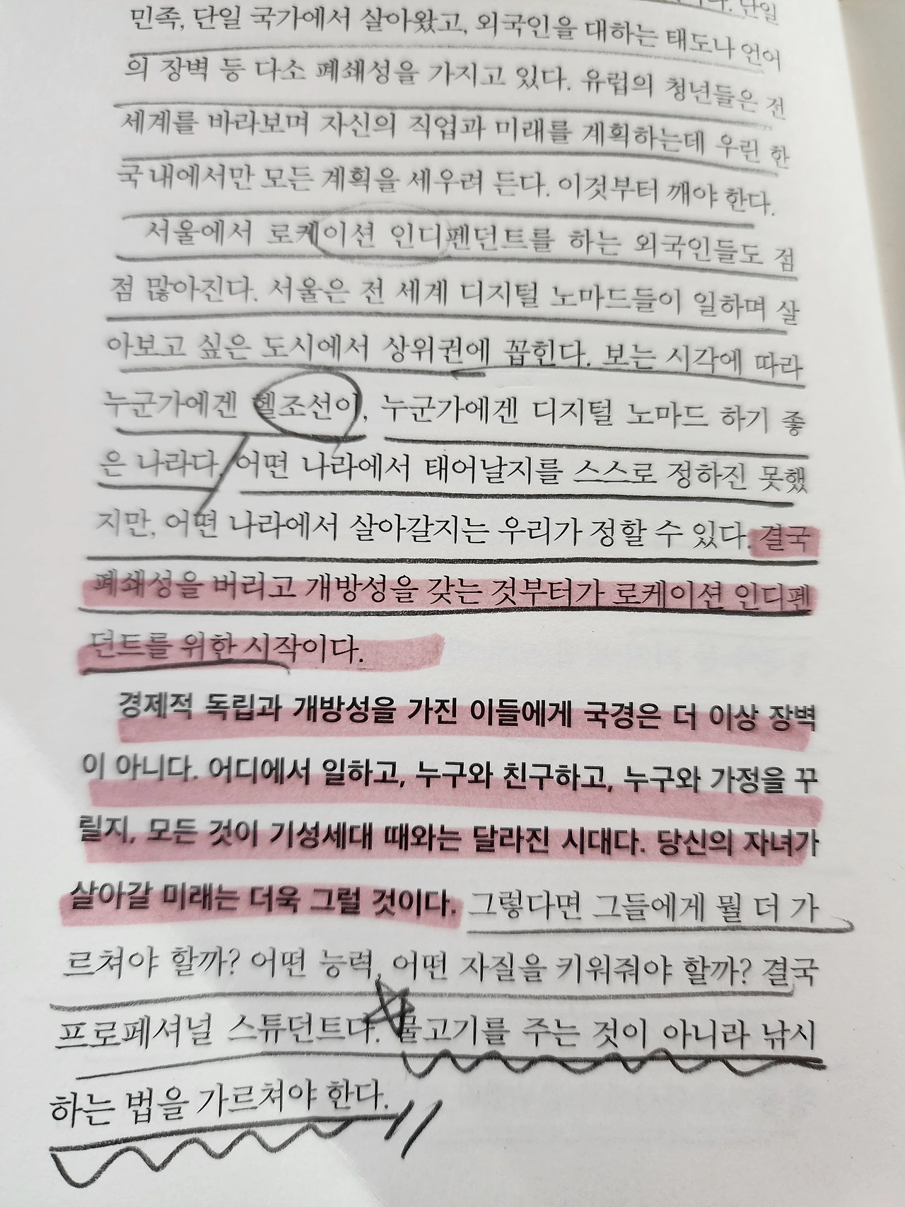 [결국 폐쇄성을 버리고 개방성을 갖는 것부터가 로케이션 인펜던트를 위한 시작이다. 경제적 독립과 개방성을 가진 이들에게 국경은 더 이상 장벽이 아니다. 어디에서 일하고 누구와 친구하고 누구와 가정을 꾸릴지 모든 것이 기성세대 때와는 달라진 시대다. 자녀가 살아갈 미래는 더욱 그렇다 그렇다면 그들에게 뭘 더 가르쳐야 할까? 어떤 능력, 어떤 자질을 키워줘야 할까? 결국 프로페셔널 스튜던트다. 물고기를 주는 것이 아니라 낚시하는 법을 가르쳐야 한다. ]