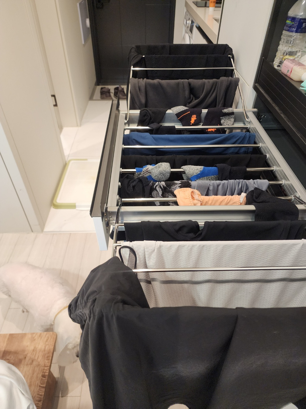 주말동안 머리도 식힐겸 영종도에 다녀왔다. 드럼 세탁기가 방에 비치되어 있어서 빨래까지 해버렸는데 세상에나 팬트리 작은 서랍을 꺼내니 건조대가 펼쳐졌다. 고민이 한방에 해결되는 이 상황이 감격스러웠다. 매번 주렁주렁 빨랫감을 널어 놓는 것이 보기 싫었는데 이것이 해결되니 너무 좋았다.