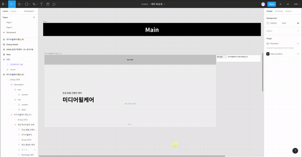 이제 본격적으로 화면 영역을 그려보도록 할 텐데, 실제 운영되고 있는 사이트를 보고 역으로 스토리보드를 작성해보겠습니다. 얼마 전 베타 오픈을 진행한 간병인 중개 플랫폼 ‘미디어윌케어’ 사이트를 참고했습니다. 미디어윌케어 사이트 메인 화면은 최상단에 배너 이미지가 존재하고 그 하위에 모든 페이지에서 고정적으로 노출되는 GNB 영역, 메인 콘텐츠로 구성되어있습니다. 미리 컴포넌트로 만들어둔 GNB 컴포넌트 에셋을 불러와줍니다. 마찬가지로 사전에 정의한 버튼 에셋을 불러와서 메인 콘텐츠 영역 위에 노출할 버튼명을 알맞게 수정해줍니다. 현재 화면의 경우 버튼은 모두 활성화된 상태의 버튼이어야 할 것입니다.