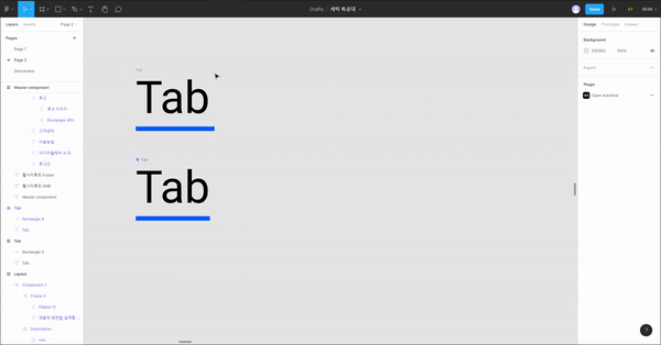 데이터의 길이에 따라서 변동 가능성이 있는 UI에는 자동으로 길이가 조정되는 Auto layout 기능을 활용하면 유용합니다. 예를 들어, 기존에 ‘Tab’이라고 설계한 탭 명칭을 ‘This is Tab’으로 길게 명칭을 바꾸어야 한다고 가정해보겠습니다. PPT를 사용하고 있다면 다음과 같은 순서대로 작업할 것입니다. 1) 가장 먼저 변경될 텍스트로 탭 명칭을 수정하고 2) 유저에게 현재 위치를 제대로 알려줄 수 있도록 활성화를 표현하는 UI를 그립니다. 주로 언더라인이 적용된 탭을 사용합니다. 3) 텍스트 길이에 맞게 언더라인을 조정합니다.