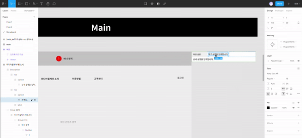 이렇게 정의해둔 컴포넌트 에셋만으로 빠르게 메인 페이지를 그려냈습니다. 화면을 다 그리고 나면 각 버튼, 콘텐츠 UI 요소들에 대한 설명을 덧붙여야 합니다. Auto layout이 적용된 우측 디스크립션 영역에 번호를 부여하여 설명을 달아줍니다. 이때, 좌측 화면 영역에 상단 부분부터 차례대로 번호를 매겨 설명을 작성하는 것이 작성하는 기획자 본인과 읽고 작업해야 할 디자이너, 개발자 등 모두가 이해하기 수월합니다.