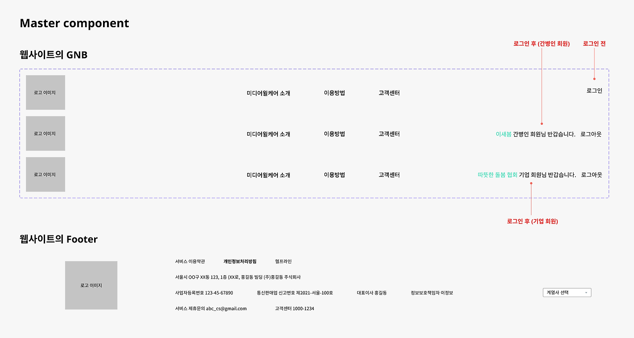웹사이트를 제작할 때 헤더 영역에 노출할 로고와 GNB, 푸터 영역에 노출할 정보들을 정의해야 합니다. 헤더는 거의 모든 페이지에 고정적으로 노출되며, 푸터는 경우에 따라 메인 페이지에만 노출할 수도 있습니다. 또 헤더는 로그인 전과 후로 UI가 나뉠 수 있고, 회원 유형에 따라 구분될 수 있기 때문에 타입에 맞는 컴포넌트를 만들어두면 좋습니다.