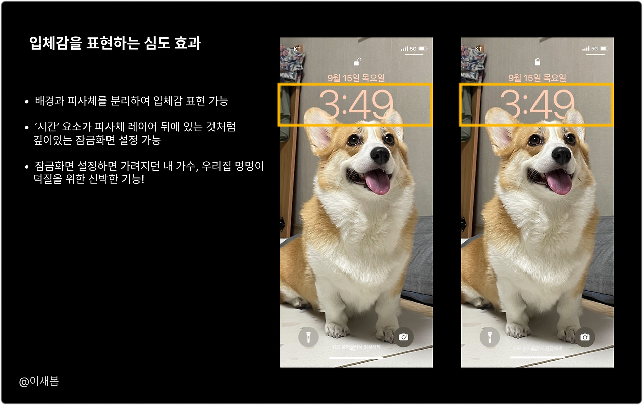 심도 효과 기능을 켜면 피사체를 인식하여 해당 피사체를 ‘시간’ 요소보다 앞에 위치시켜줍니다. 이때 피사체를 분리하는 기술은 iOS 16 업데이트 기능 중하나인 ‘누끼 따기’ 기능을 베이스로 동작하는 것 같습니다. 그동안 잠금화면 시계에 가려져야만 했던 나의 최애 가수, 연예인, 우리 집 댕댕이가 더욱 입체적으로 표현될 수 있습니다. 단, 피사체를 가리는 물체가 존재한다거나 피사체와 배경을 분리하기 어려운 이미지의 경우 심도 효과 적용이 어려울 수 있습니다.