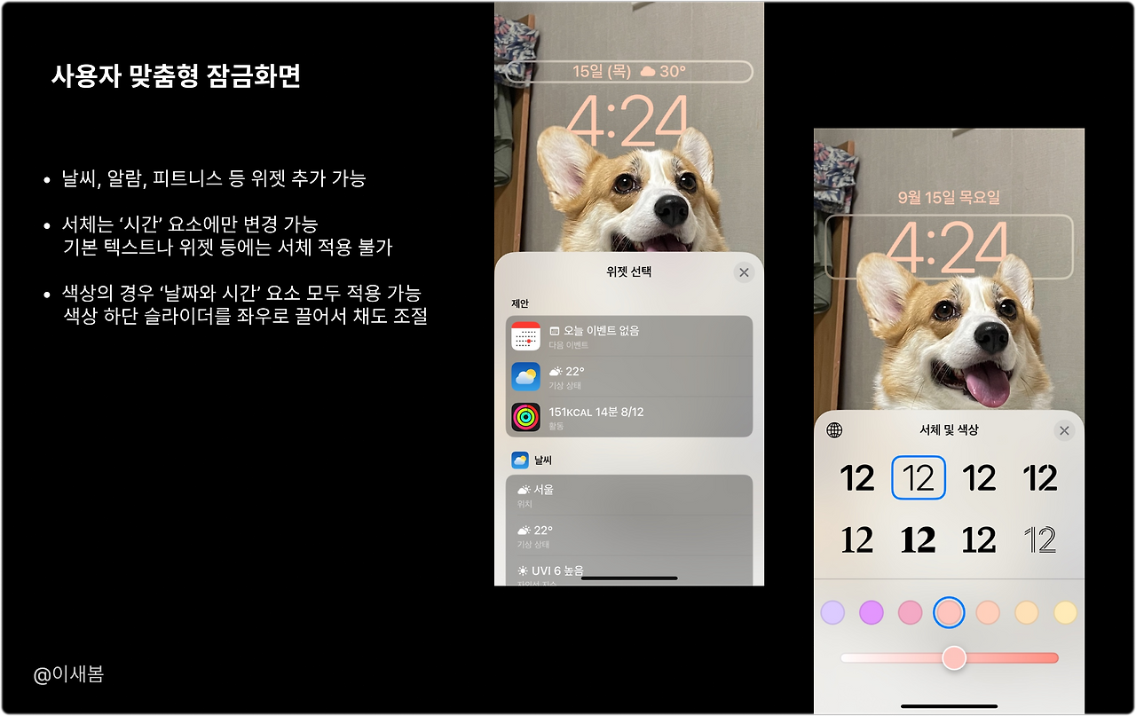 이번 업데이트에서 가장 눈에 띄는 것 중 하나가 바로 잠금화면입니다. 사용자가 원하는 대로 부분 커스텀할 수 있는 기능을 제공하기 때문인데요. 잠금화면에 표시되는 '시간'의 서체 및 색상을 변경할 수 있게 되었습니다. 저희 집 웰시코기 솜이와 잘 어울리는 핑크색으로 설정해보았는데 정말 귀엽죠? 처음 업데이트를 하고 나니 '시간' 부분이 너무 두꺼운 못생긴 서체라서 깜짝 놀랐는데, 다행히 맘에 드는 서체가 있어 변경할 수 있었습니다. 다만, 서체 크기를 조절할 수 없다는 점이 다소 아쉽습니다.