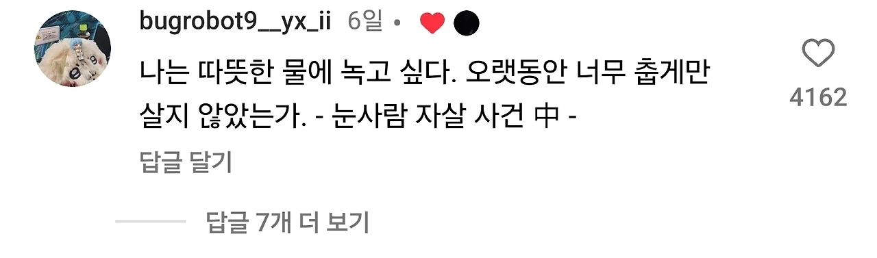 혹자는 살아있음에 감사를 느끼라 말하지만, 그들에게 묻고 싶었다. 얼어붙은 삶의 의미를, 추위에 떨며 얇은 숨을 간신히 이어가는 생을 대체 어떻게 감사하라는 것인가.