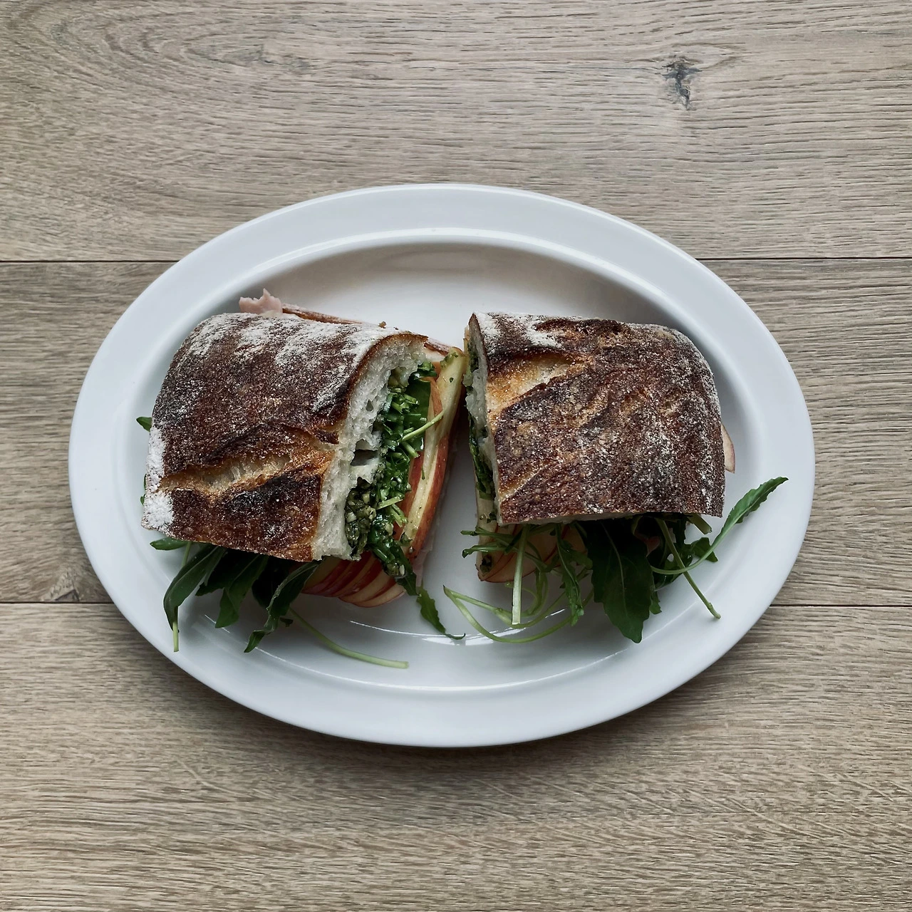 달콤 쌉싸름한 홀머스터드 소스와 직접 만든 바질 페스토 위로 얇게 썬 사과와 햄, 하바티 치즈, 루꼴라가 차곡차곡 쌓인다. 한입 크게 베어 물 때마다 문득 ‘이건 이제 원조와는 전혀 다른 샌드위치가 되어버렸구나’ 하는 생각이 스치지만, 내 입맛에는 이대로 충분하다.